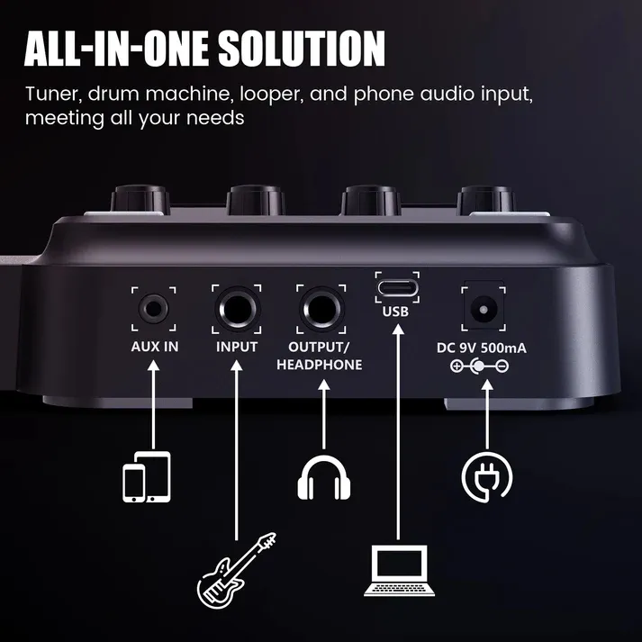El pedal ofrece una amplia gama de módulos de efectos que incluye: 12 Drive, 6 Delay, 4 Reverb, 4 Dynamic, 3 Filter y 12 efectos de modulación. Permite hasta 5 módulos al mismo tiempo, con 10-59 ajustes pre-establecidos disponibles para una configuración rápida de tono. Este pedal funciona con algoritmos de primer nivel y ofrece 18 modelos de amplificador/Cabina, todos impulsados con tecnología R avanzada. Amplia gama de sonidos para performances versátiles. Cuenta con una máquina de tambor incorporada con 6 estilos y más de 40 patrones de ritmo, ofreciendo variedad de pistas de acompañamiento. El looper puede grabar hasta 25 segundos y permite sobregrabación ilimitada, permitiendo infinitas posibilidades creativas.